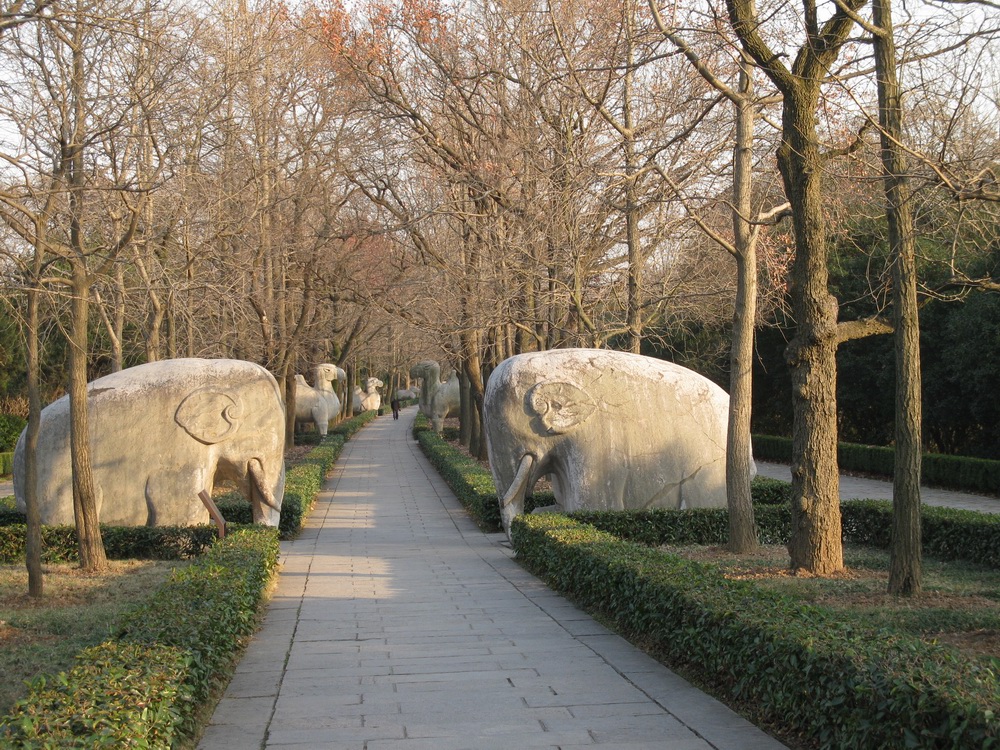 按照正常的入園路線,從四方城開始。四方城內(nèi)巨大的石碑首先給人強(qiáng)烈的視覺沖擊,碑的高度約3層樓房,一個(gè)巨型石龜馱負(fù),據(jù)說是目前世界上最大的石碑。幾乎不能想象當(dāng)時(shí)是如何把這石碑運(yùn)到山上,又如何樹立起來的?或許借助杠桿和三腳架滑輪之類的工具吧。碑頂云龍紋裝飾,碑文為朱棣手書,吹噓太祖功德。朱棣的楷書非常漂亮,顛覆了我對(duì)他的一貫武夫梟雄印象。接下去是約一華里石象路,兩側(cè)排列麒麟、大象、駱駝,獅等雕像,數(shù)量眾多、雕飾寫實(shí)精美。走完石象路,就是翁仲道,道旁分列文官武將,應(yīng)該就是這些將領(lǐng)幕僚輔佐太祖光復(fù)漢人河山的吧!不免讓人產(chǎn)生十分敬重之感,更覺高大古樸!以上是神道部分。