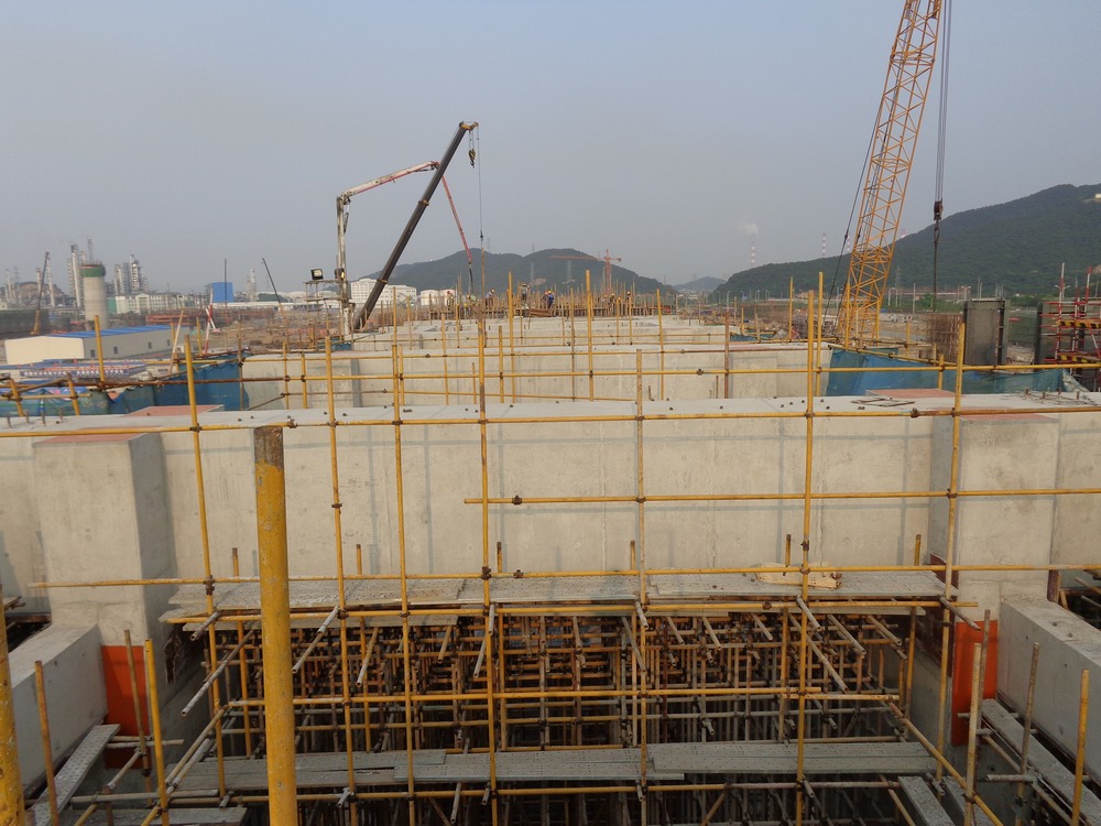 PDH裝置是寧波海越丙烷與混合碳四利用項目的核心裝置,而反應框架是PDH裝置標志性的建筑,自2013年1月16日開工以來,一直受到業(yè)主、監(jiān)理、EPC的高度關注,它全長114米,寬26米,高33.25米(其中基礎高13米),具備柱子(1000×2700)、梁(1500×2600)截面大,支模架高度高(13.411米),承重架搭設量大,地腳螺栓和預埋件數量多且大(預埋件單塊最大重1.5t)的特點,同時涉及到高大模板及其承重體系、地腳螺栓安裝、大體積混凝土澆筑等多項專項施工方案的編制以及論證,且受施工工期緊、作業(yè)面及操作面狹小、施工過程中雨天頻繁、施工工藝操作難度大等因素影響,但寧波海越項目部堅持發(fā)揚“一家人、一條心、一股勁、一個目標”的精神,項目部上下齊心合力克服重重困難,積極調動各方資源力量,與班組緊密合作,精心組織,合理安排,不僅保證了反應框架的進度控制點,而且施工實體質量和表觀質量也得到各方的高度評價。反應框架優(yōu)質的施工質量在施工過程中曾多次作為樣板工程供海越丙烷與混合碳四利用項目各總包單位和分包單位觀摩的對象,且2013年4月我項目部憑著反應框架的出類拔萃的混凝土質量以及高度精準的地腳螺栓預埋工作,被評為2013年浙江省工程建設優(yōu)秀質量管理小組。