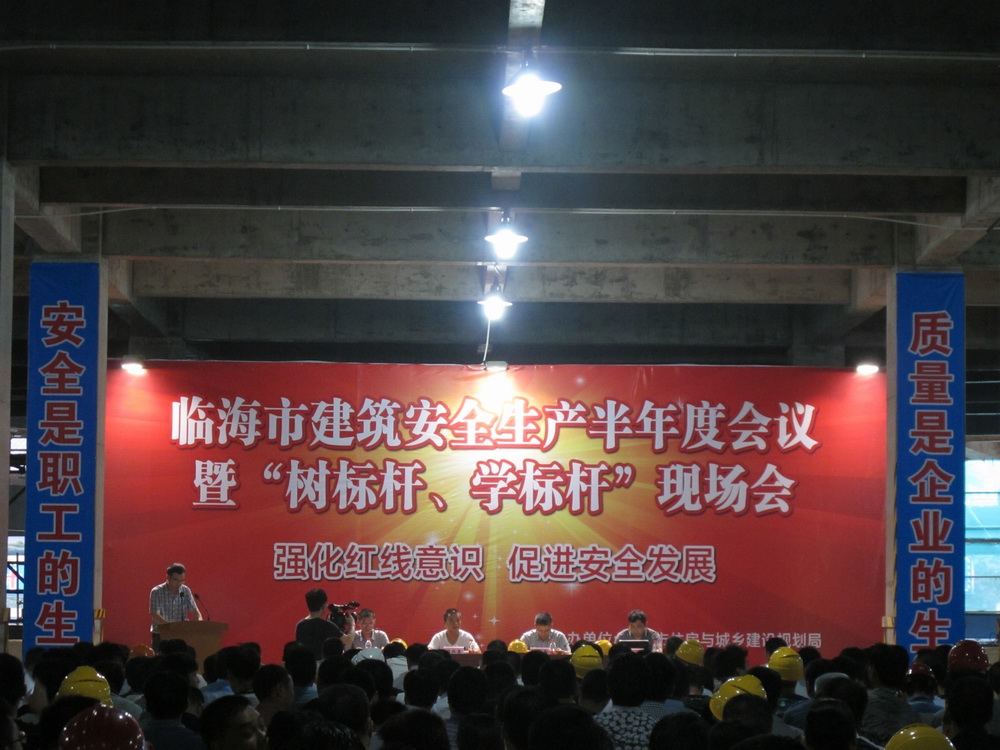 6月27日,圍繞“強化紅線意識、促進安全發(fā)展”的安全生產(chǎn)月主題,臨海市住房與城鄉(xiāng)規(guī)劃局組織在我集團公司承建施工的朗成大時代商住樓項目(2#、辦公樓、商業(yè)綜合樓)現(xiàn)場召開臨海市建筑安全生產(chǎn)半年度會議暨“學(xué)標(biāo)桿、樹標(biāo)桿”現(xiàn)場會,臨海市房屋建筑施工總承包企業(yè)的主要負責(zé)人、分管質(zhì)量安全負責(zé)人、監(jiān)理企業(yè)主要負責(zé)人、在臨施工外地企業(yè)分管質(zhì)量安全生產(chǎn)負責(zé)人及駐臨監(jiān)理企業(yè)負責(zé)人、在建工程項目負責(zé)人及項目總監(jiān)等近300余人參加了此次現(xiàn)場會。會議由市質(zhì)量監(jiān)督站站長葉青主持,參加會議的領(lǐng)導(dǎo)有市住建局副局長陳勇智、市安監(jiān)局副局長周邦春、市建筑業(yè)管理局副局長李春等。
